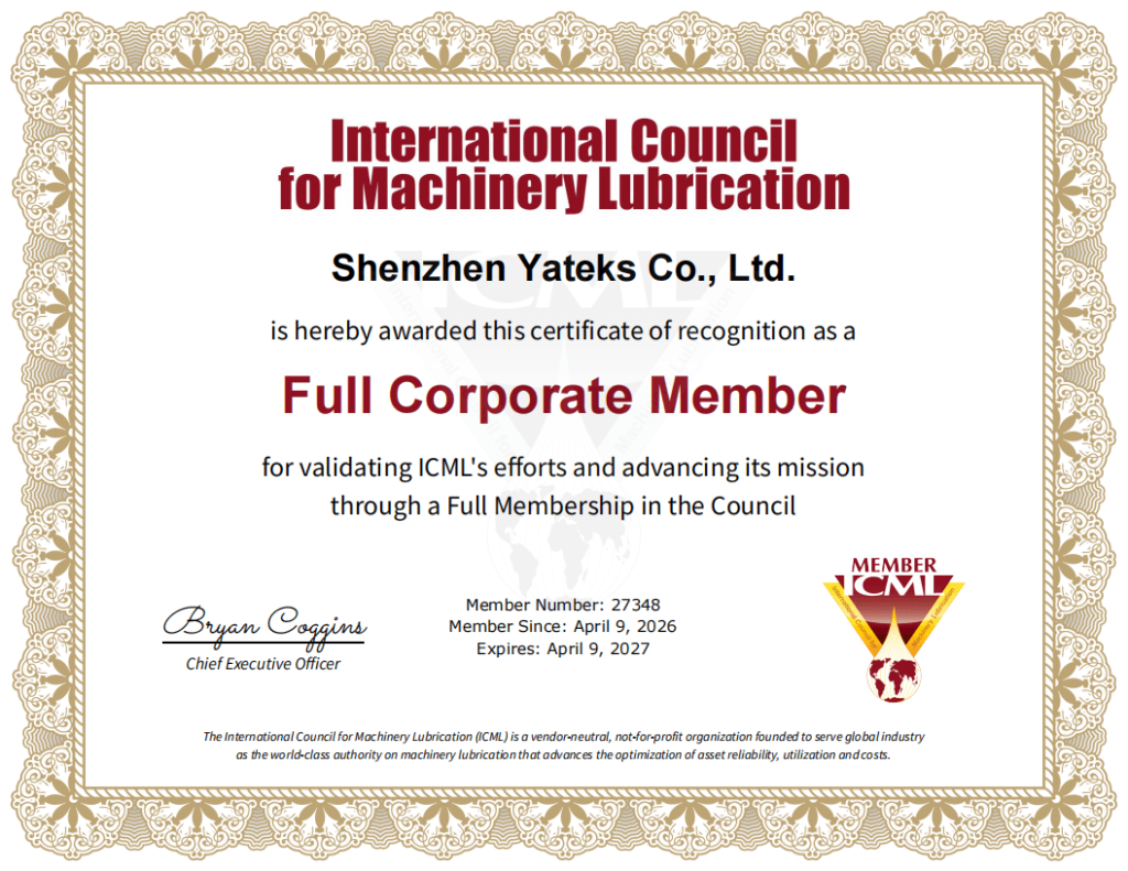 Shenzhen, China – Shenzhen Yateks Co., Ltd., a forward-thinking leader in industrial solutions, is proud to announce that it has been awarded Full Corporate Membership by the International Council for Machinery Lubrication (ICML) – a globally respected, vendor-neutral, not-for-profit authority in machinery lubrication.